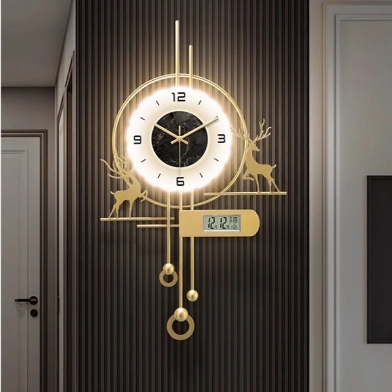 ساعة حائطية معدنية أنيقة بتصميم ريفي مع مجسمات غزلان، مثالية لتزيين غرفة المعيشة.