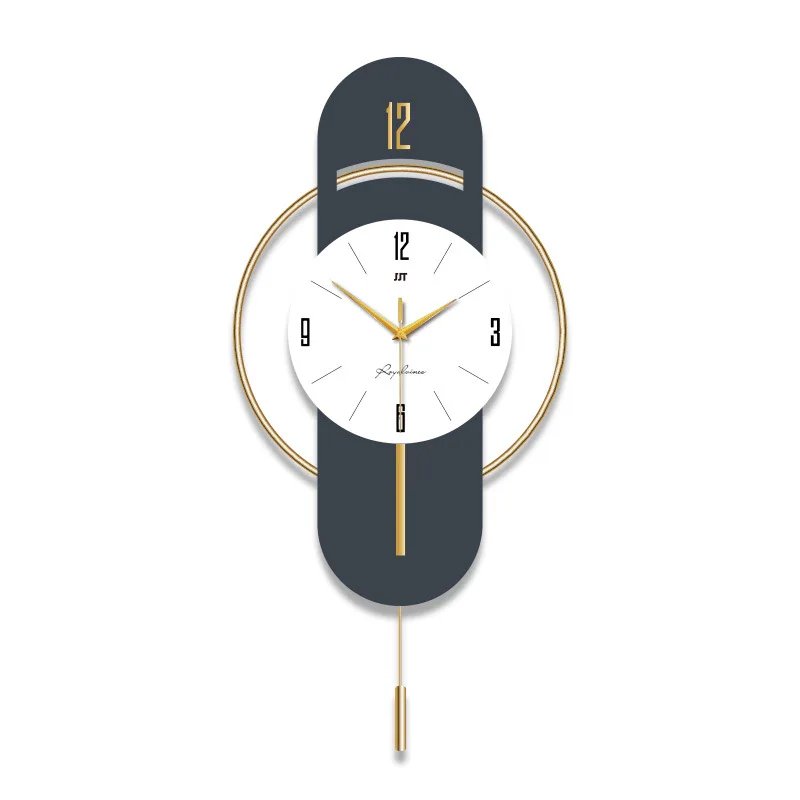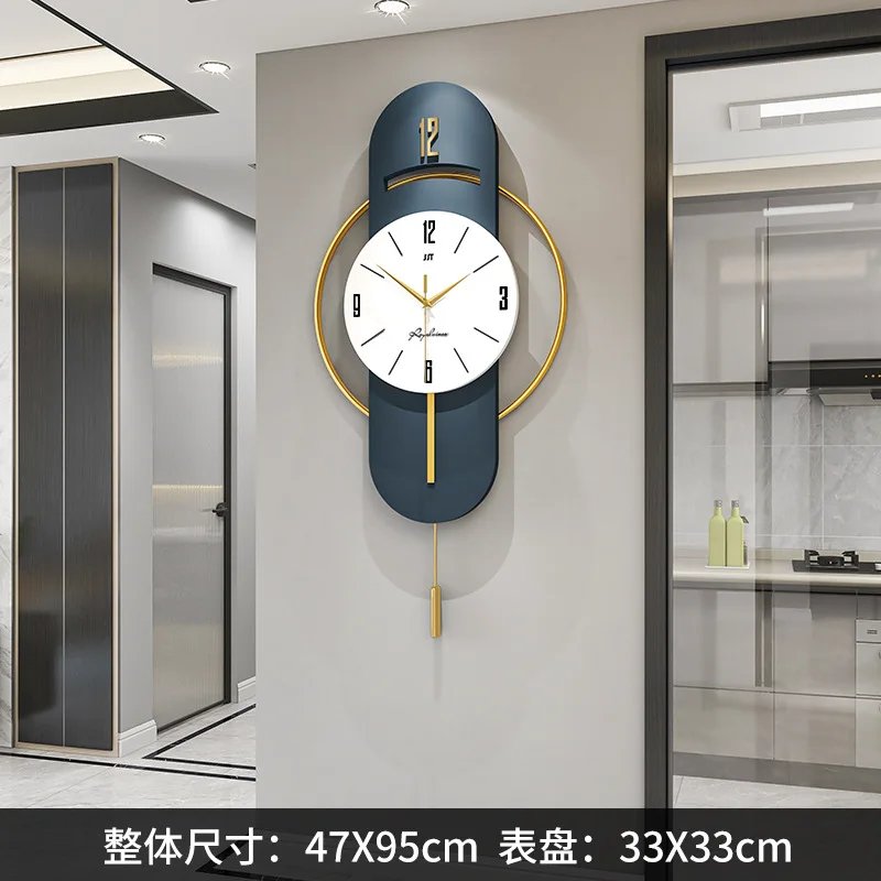 ساعة مصنوعة من معدن عالي الجودة وزجاج، بتصميم عصري وألوان ذهبية وزرقاء. أبعادها تقريباً 95 سم ×47 سم. تناسب غرفة المعيشة أو المدخل. تصميمها الفريد يضفي لمسة أناقة وحداثة.