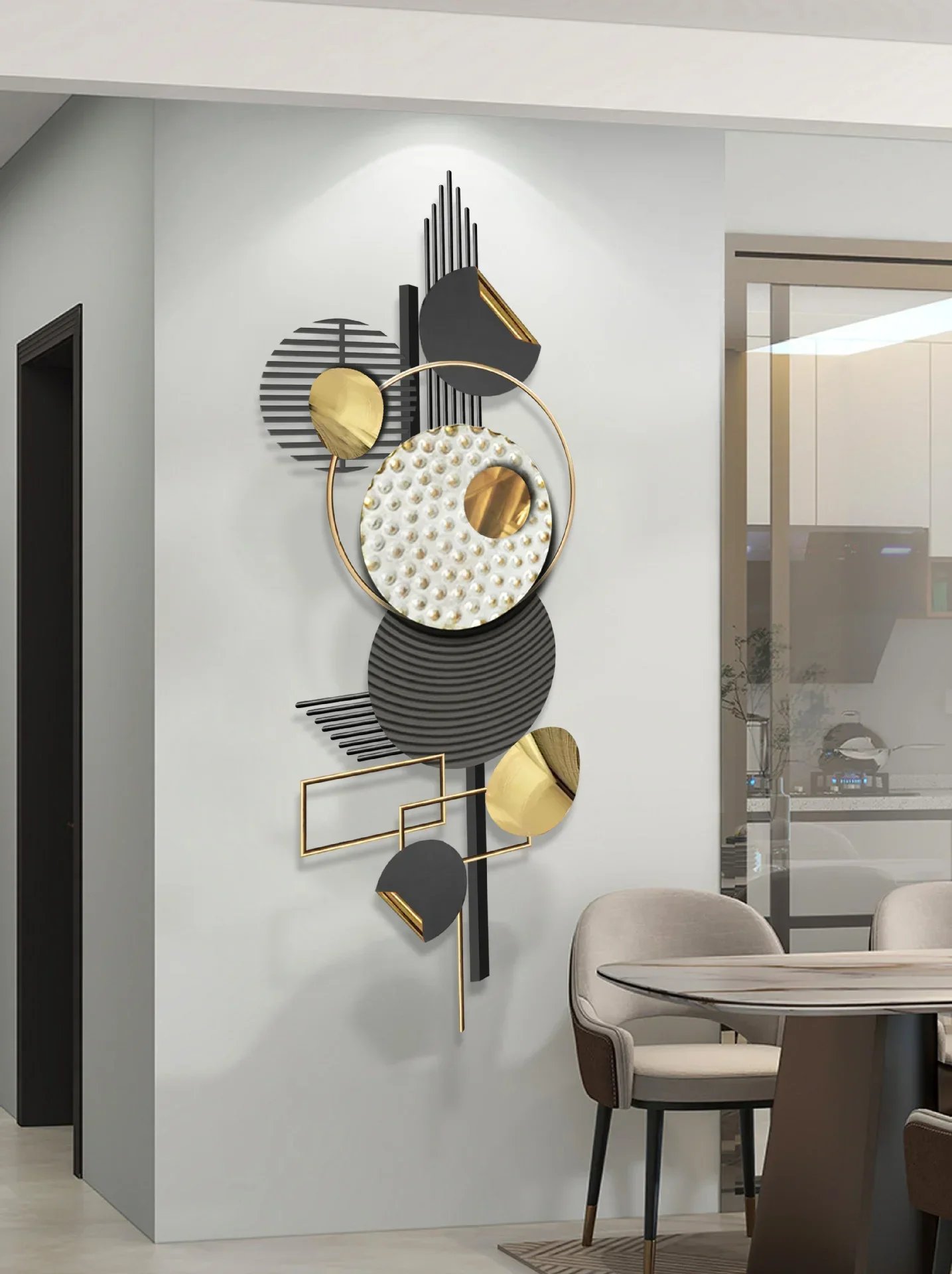 مصنوعة من المعدن عالي الجودة، بتشطيب متقن. تصميم عصري بألوان ذهبية وسوداء وبيضاء. الأبعاد: 150 سم × 60 سم. مثالية لغرفة المعيشة أو المكتب. تضيف لمسة فنية مميزة لأي ديكور.